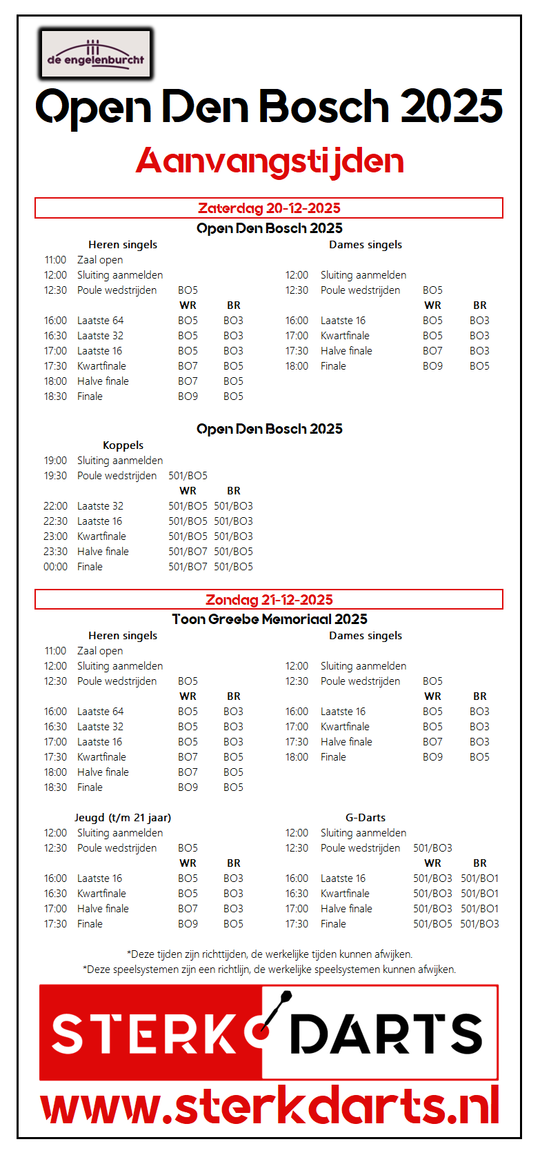 | Type | Heren singles | Dames singles | Heren koppels | Dames koppels | Jeugd (t/m 21 jaar) | G-Darts |
