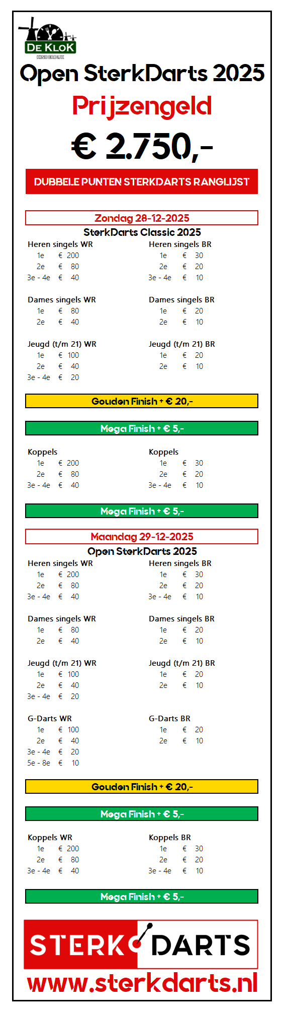 Het jaar sluiten we traditiegetrouw af op 28 & 29 december met het Open SterkDarts! De locatie betreft net als de afgelopen 3 jaar Partycentrum De Klok in Kinderdijk.