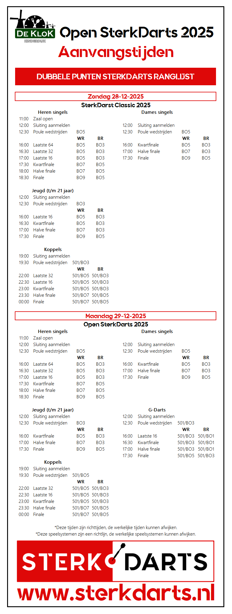Een dag later zal er op 29 december tijdens het Open SterkDarts op de maandagmiddag van de oudejaarsweek gestreden worden om de heren singles, dames singles titels, G-Darts én jeugd (t/m 21 jaar), in de avond wordt een koppeltoernooi gehouden én dat is dan écht het laatste toernooi van het jaar!